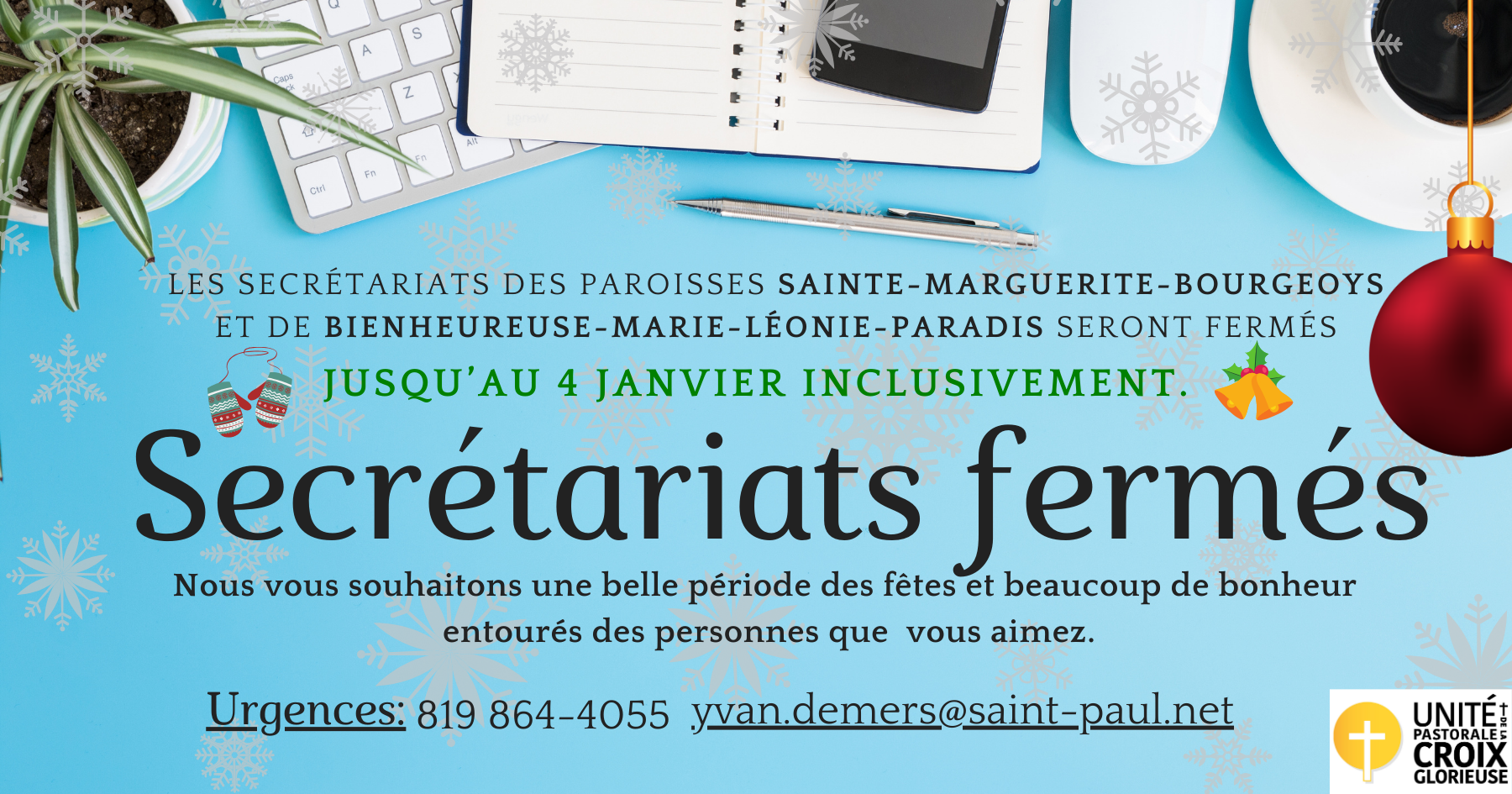Noël -Secrétariats fermés 22 déc au 4 janvier incl. FÊTES 2025